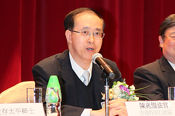| 副主席李日誠牧師致辭。 | 主禮嘉賓香港特別行政區終審法院常任法官陳兆愷法官致辭。 |
