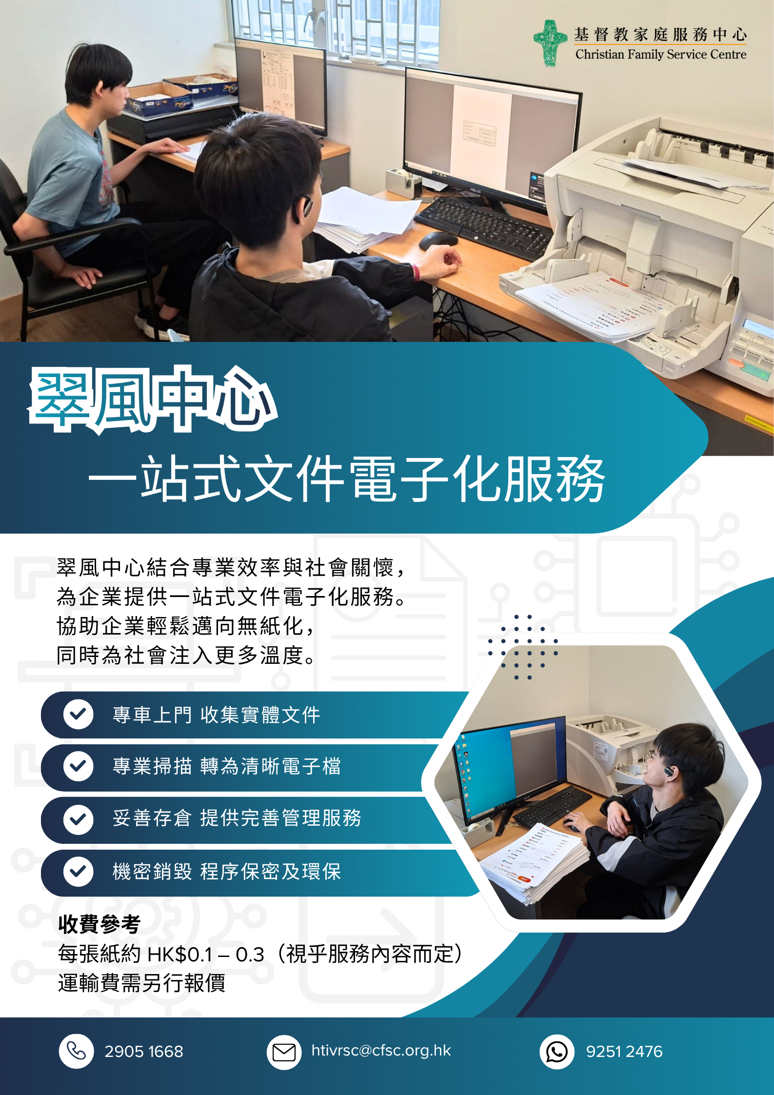 翠風中心誠意推出結合專業效率與社會關懷的一站式文件電子化服務,協助企業輕鬆邁向無紙化,同時為社會注入更多溫度。