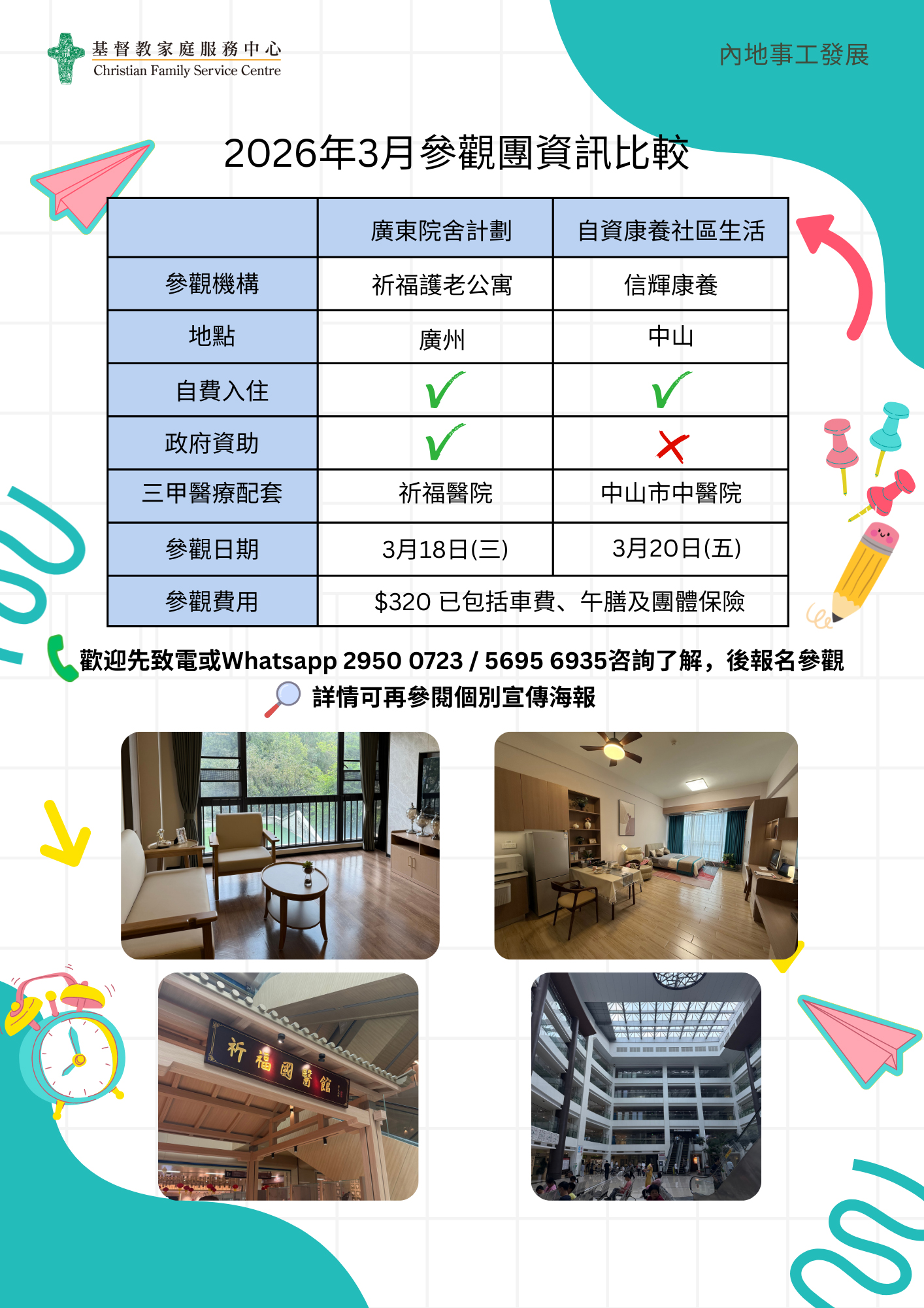 3月CFSC內地事工發展會舉辦一系列兩個參觀團,讓有不同需求、對灣區康養生活有興趣的人士可以親身參觀了解灣區的生活環境及醫療配套。
