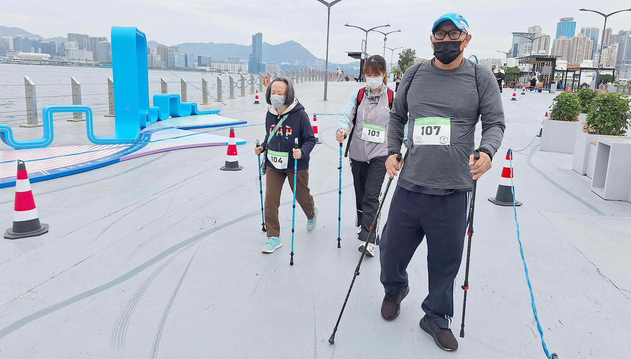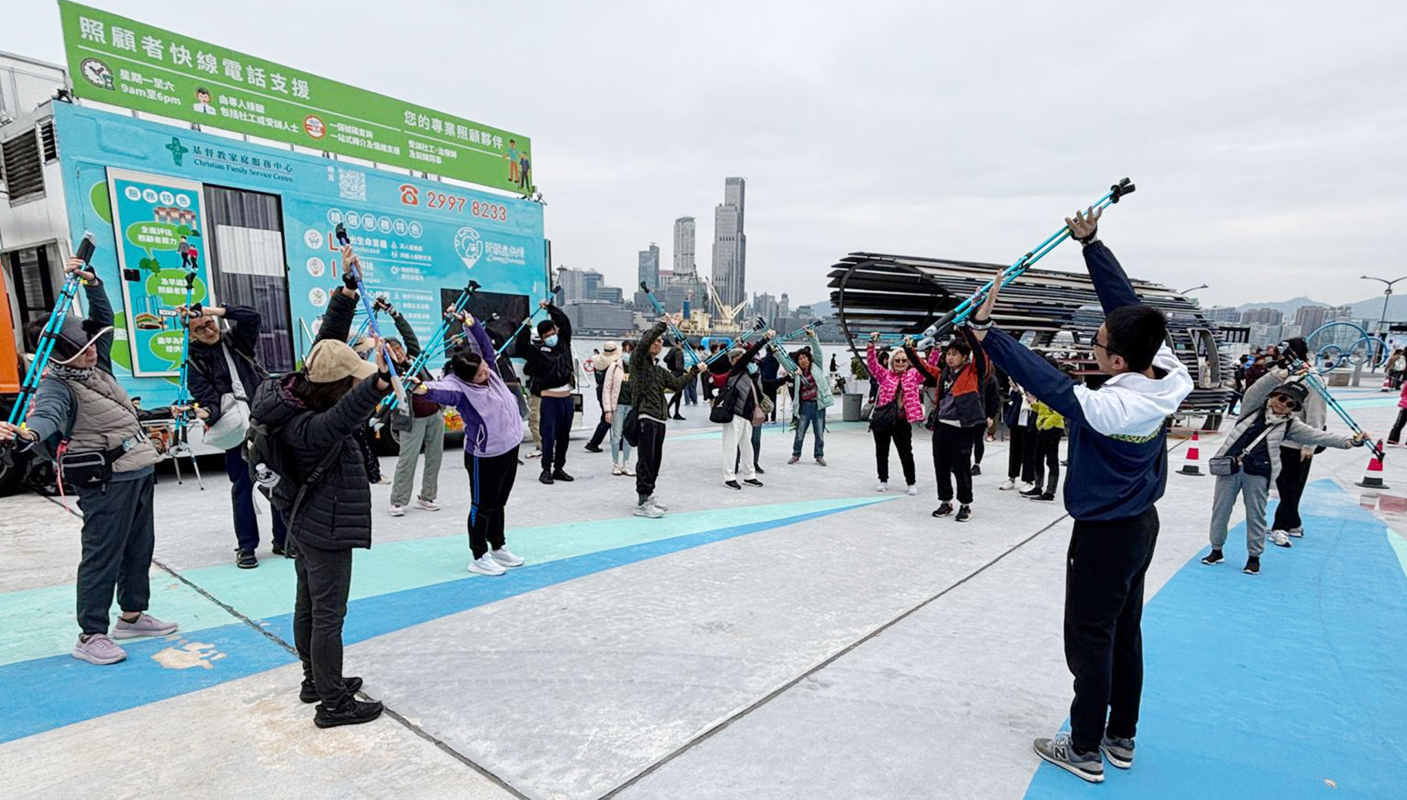 活動當天天朗氣清,來自不同單位的服務使用者及照顧者在灣仔維多利亞海旁一同進行北歐式健步行活動,欣悅坊—地區支援中心物理治療師謝兆翔先生更帶領服務使用者及照顧者進行熱身環節,讓大家為比賽作好預備。